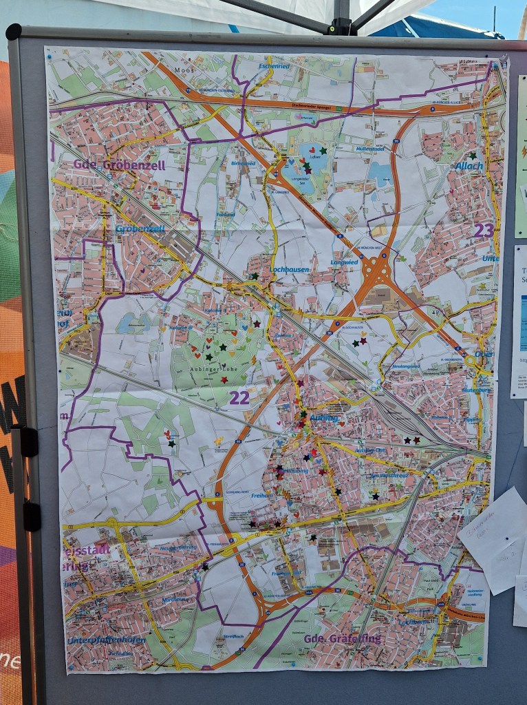 Während der Stadtteilwoche in Aubing – Langwied – Lochhausen waren wir am 19. und 20. Juli mit unserer Bürgerinitiative „Der Westen ist bunt“ am Info-Markt vertreten. Von der Hitze ließen sich die Besucher:innen nicht abhalten, sich über ihren Stadtteil zu informieren und das Kulturangebot zu genießen. Großes Interesse und den Einstieg in gute Gespräche bot unsere Stadtteilkarte: Es wurden Herzen für Lieblingsorte vergeben, Sternchen für gute Treffpunkte oder Blitze für kritische Orte.